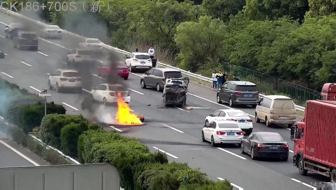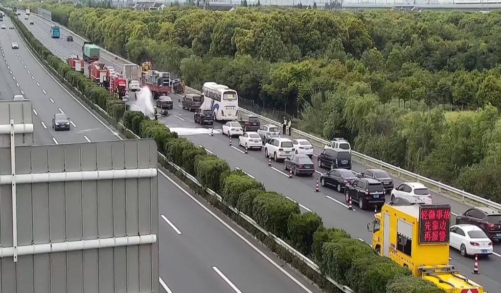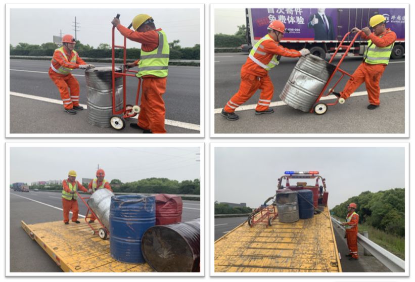 日常巡查发现事故 当天14:56分,指挥中心视频巡查时发现沪宁方向K187处一辆小货车仰面翻在第4车道上,所载油桶滚落至第1、2车道并引发明火燃烧,沿途车辆纷纷紧急避让。指挥中心立即调度各方救援力量赶赴现场并通过沿线情报板发布事故信息提醒过往司乘减速慢行。 多方联合及时救援 15:05分,养排、交警、路政、安保、消防等单位相继到场,迅速展开救援工作;15:12分,养排人员将占道事故车拖曳靠边;15:14分,火势得以控制、明火成功扑灭,散落油桶也被成功转移至应急车道,现场车道全部开通。 灵活处置精准高效 之后,如何清理遗留在应急车道的6只满载精磨液压油油桶(单桶约340斤)成了棘手问题。按常规处理需要吊车或叉车进行驳载,但现场正值流量高峰时段,并且因事故已缓行约1公里,如使用吊车或叉车驳载势必造成现场拥堵。为既快又稳清理现场油桶,确保道路畅通,养排中心派出仓库配备的油桶搬运车和落地式平板车赶赴现场支援,搬运、固定……仅用了17分钟,现场油桶全部成功清理。