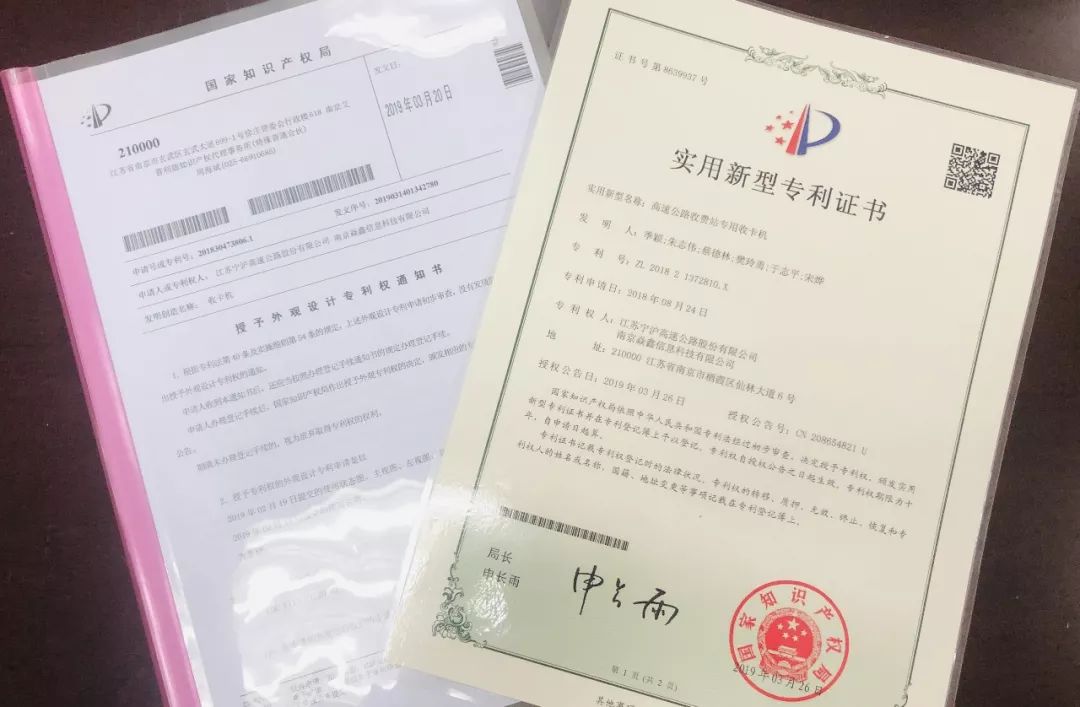 近日,南京收费站历经一年时间研发的“高速公路收费站专用收卡机”成功获得国家知识产权局授予的实用新型专利证书和外观设计专利权通知书,为后期QC研发奠定了基础,提供了专用技术保障。