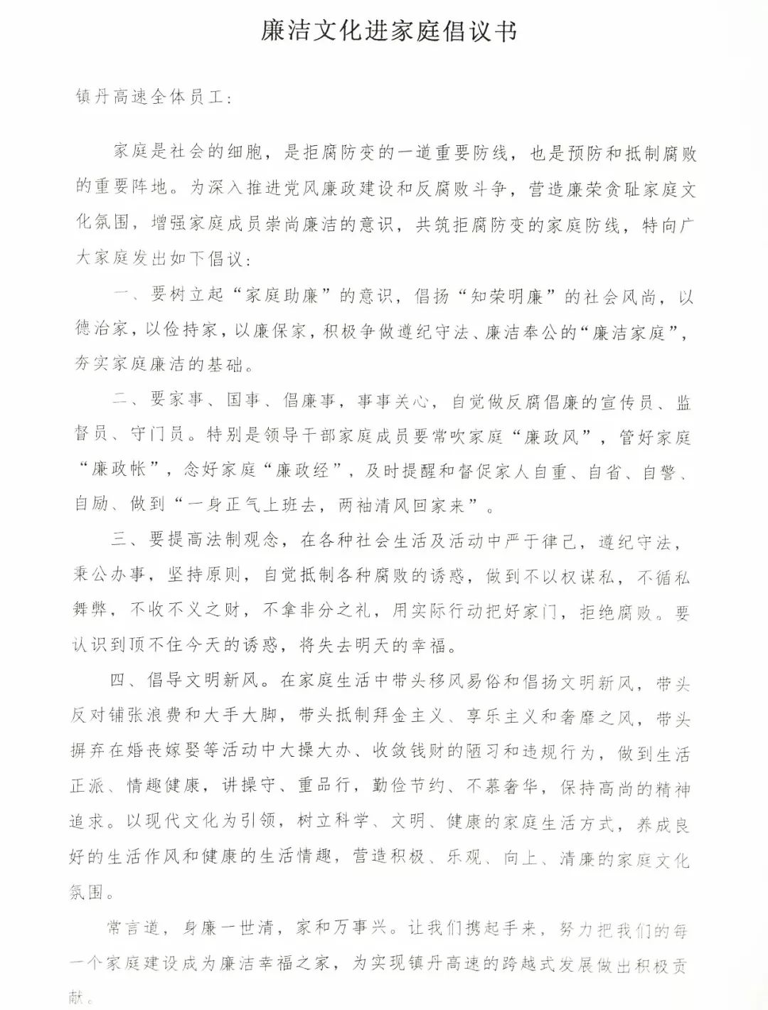 廉洁文化进站区。通过集中组织开展廉政理论学习、观看廉政视频、利用“先锋荟”“学习强国”开展线上学习等,提高党员干部反腐倡廉思想意识;开展廉洁风险自查,发挥好“三大员”监督职责,畅通反映问题渠道,防患于未然;紧盯“四风”问题,走进职工队伍主动约谈和询问情况,让职工成为反腐监督的有力防线。 廉洁文化进班组。把加强班组管理放在首位,通过班组会、班前班后会、一对一帮扶等多种途径,向员工讲述廉洁故事、分析警示案例、宣传廉洁观念,帮助广大员工树立正确的人生观与价值观。 廉洁文化进家庭。为深入推进党风廉政建设和反腐败斗争,弘扬文明新风,镇丹高速向全体员工发出了“廉洁文化进家庭倡仪书”,增强家庭成员崇尚廉洁意识,让家庭成为筑牢干部员工廉洁防线的重要阵地。