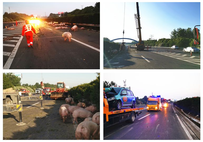 围:利用清障背驮车与车厢板将乱窜的生猪围赶到路边;吊:用吊机快速将事故车翻正,并用绳索将车厢栏板破损处捆扎好,防止车内生猪再次窜出;驳:用吊机、装载机将事故车及路面上的生猪快速驳载装运;清:清障及外协人员将路面油污及遗洒物快速处理清扫干净。由于组织得力,措施得当,整个救援仅耗时58分钟。 自公司“安全消患攻坚季”专项活动开展以来,汤山养排中心认真落实公司及宁镇管理处关于加强安全生产工作的要求,严字当头,意识为先,通过“理论学习+预案演练”的方式促进清障水平进一步提升,为护航“最美高速.大美宁镇”做出积极贡献。